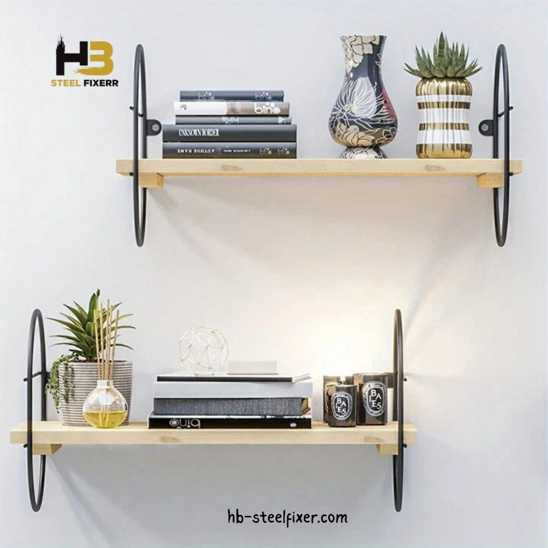 Wall-Mounted Floating Shelf, Pine Wood Surface, Black Oval Metal Frame