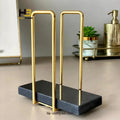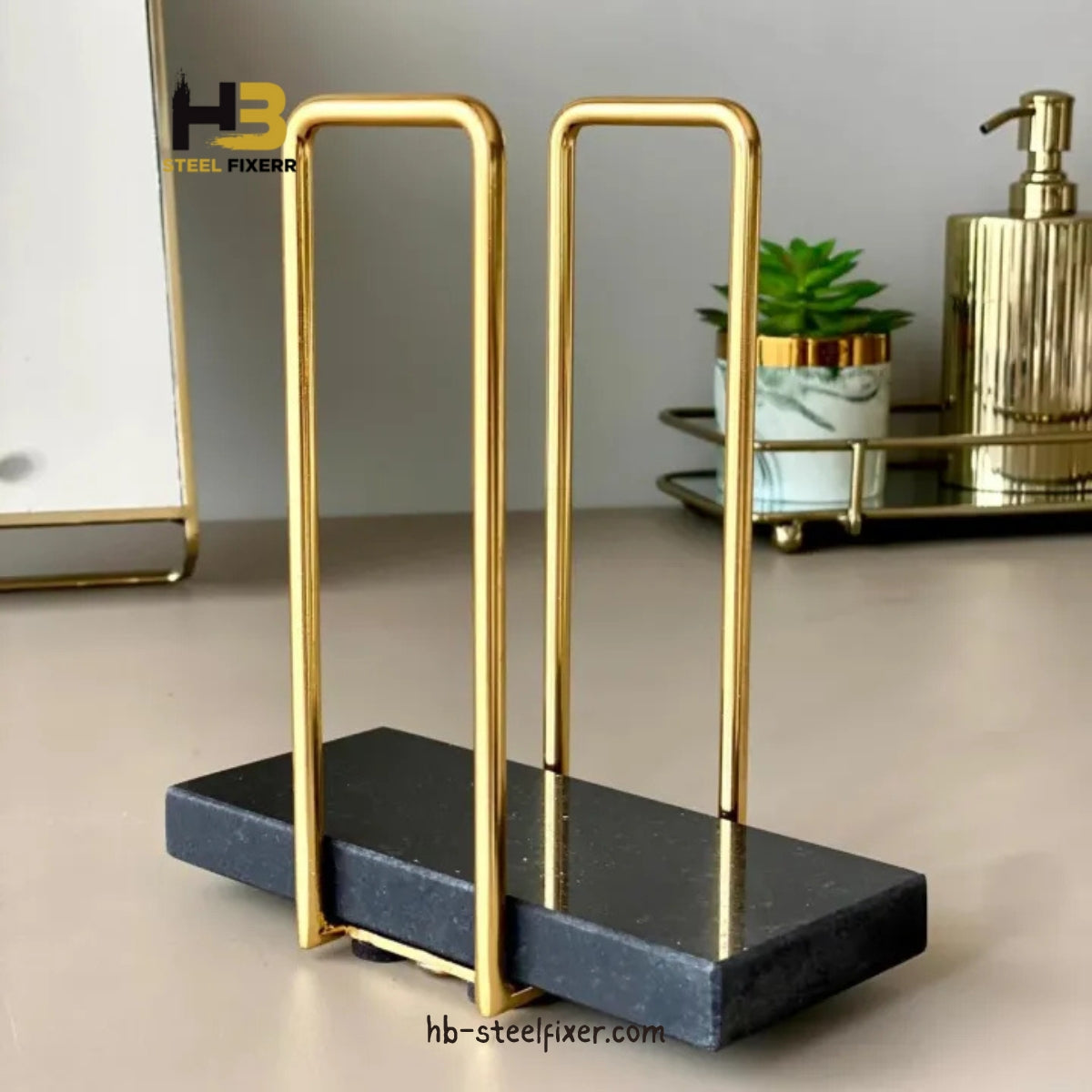 Add elegance to your kitchen or dining space with this stylish black wooden napkin holder featuring a sleek gold metal wire frame. Its minimalist design offers both form and function, making it a perfect centerpiece for everyday use — made by HB Steel Fixerr.