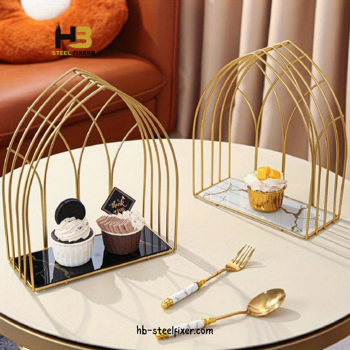 Add luxury to your dessert presentations with this birdcage-style metal dessert stand. Featuring a sleek golden frame and glossy ceramic base, it’s perfect for showcasing cupcakes, pastries, chocolates, or party treats with elegance and charm. A beautiful centerpiece for tea tables, birthdays, weddings, or cafés.