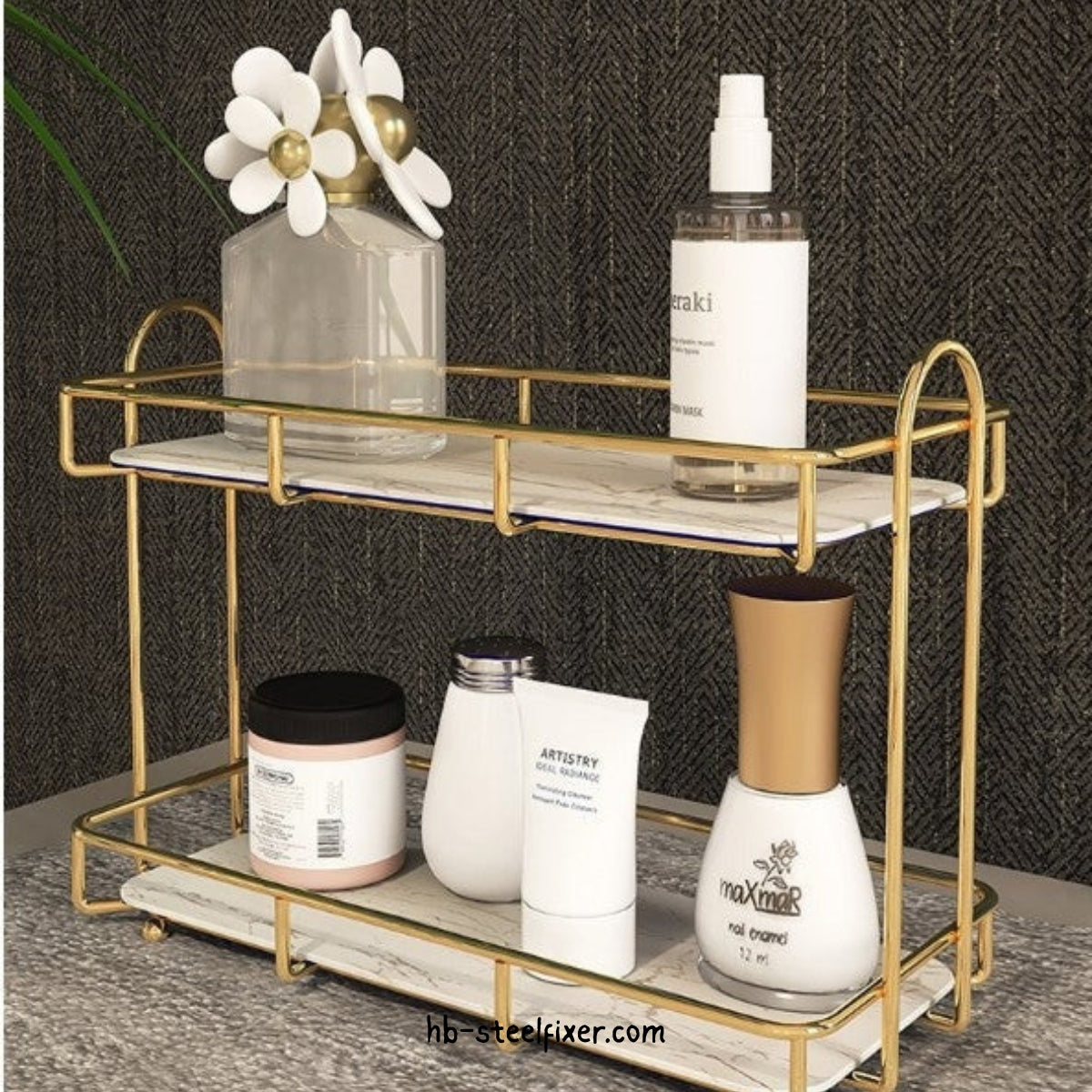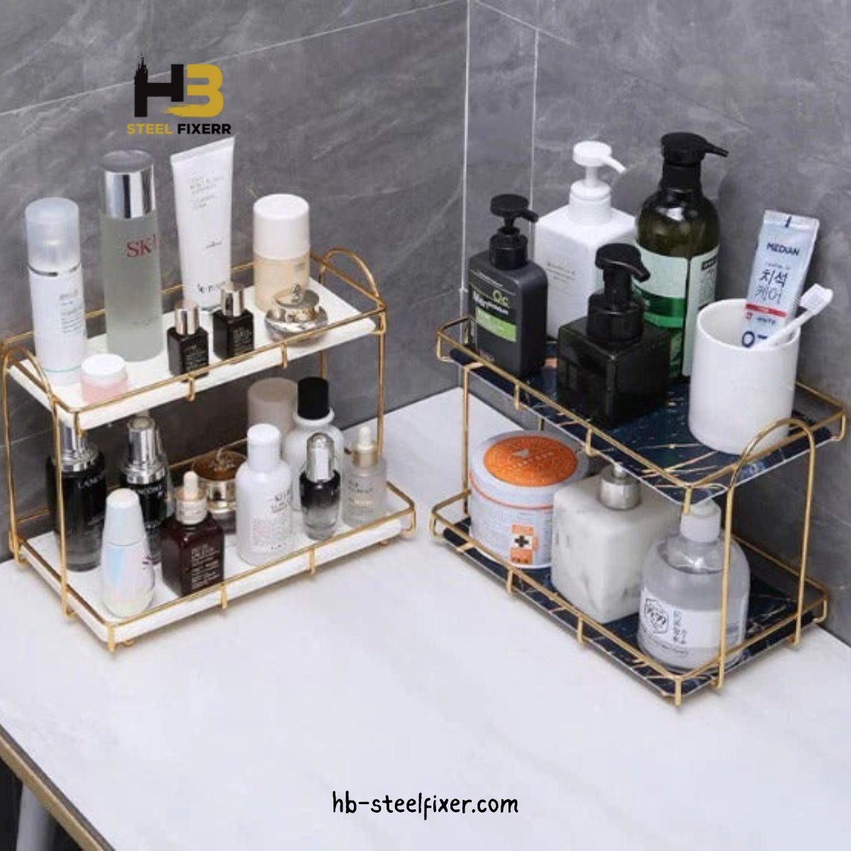 Keep your beauty essentials tidy and within reach with this elegant 2-tier makeup organizer. Designed with clear shatter-resistant acrylic trays and a metallic frame, it adds a modern touch to your vanity while offering durable, space-saving storage for cosmetics, jewelry, and more.
