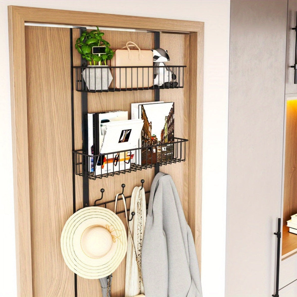 Declutter your space and stay organized with this multi-functional over-the-door storage rack. Featuring 2 deep baskets and 12 sturdy hooks, it offers plenty of room for everyday essentials like coats, keys, bags, bottles, and more. Made from premium stainless steel and finished with a noise-reducing EVA padding, it’s a stylish and practical addition to any room.
