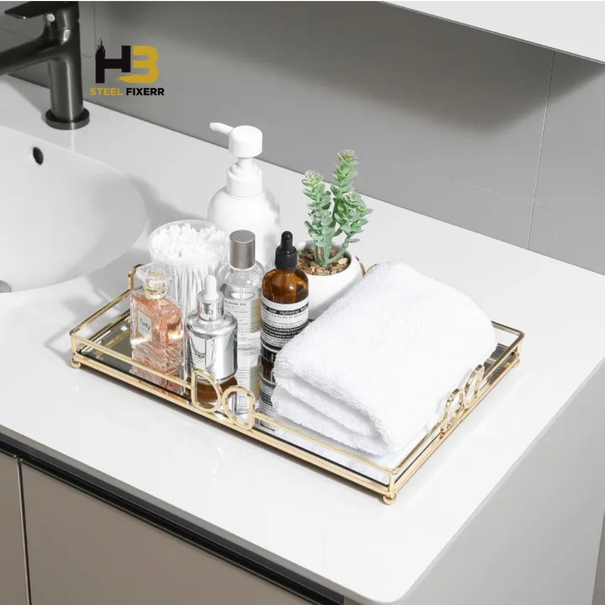 Add a touch of elegance to your space with this Nordic-style rectangular gold mirror tray. Crafted with high-quality acrylic and a golden metal frame, it’s perfect for organizing and displaying everything from cosmetics to snacks. Ideal for vanities, living rooms, and kitchens — exclusively by HB Steel Fixerr.